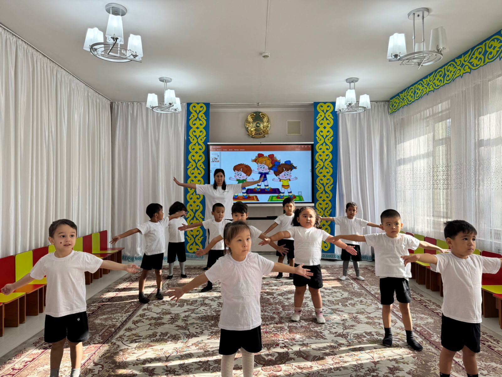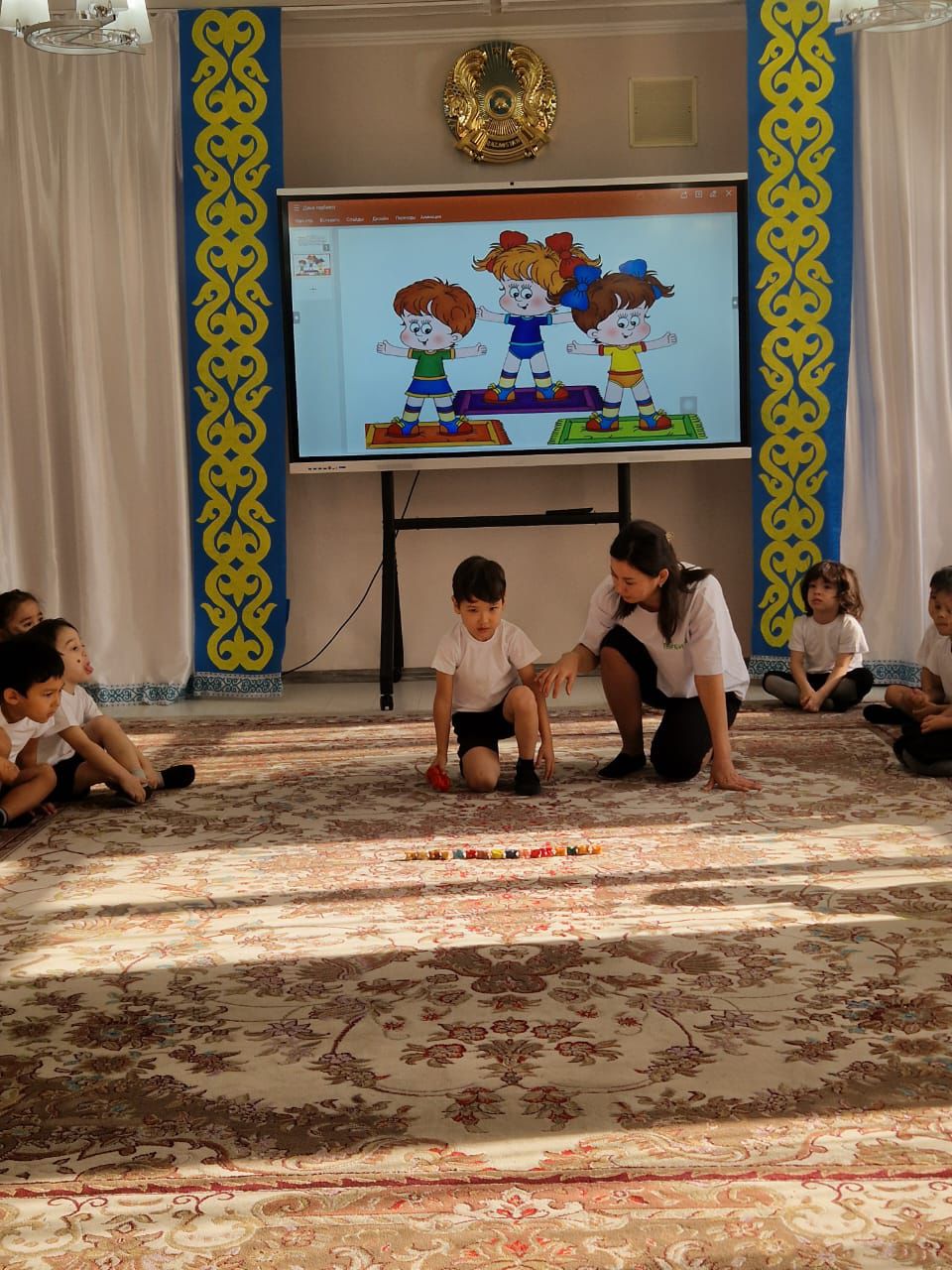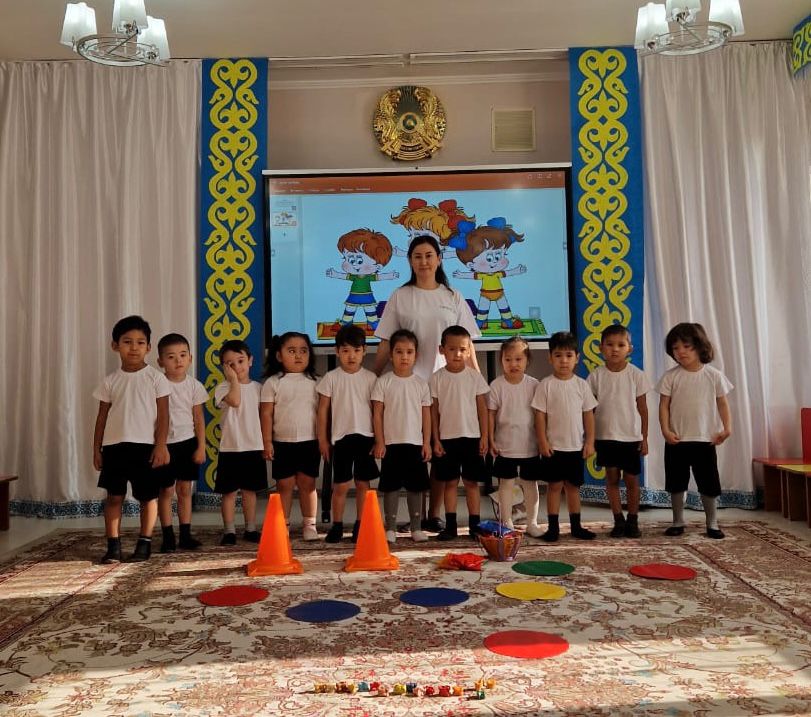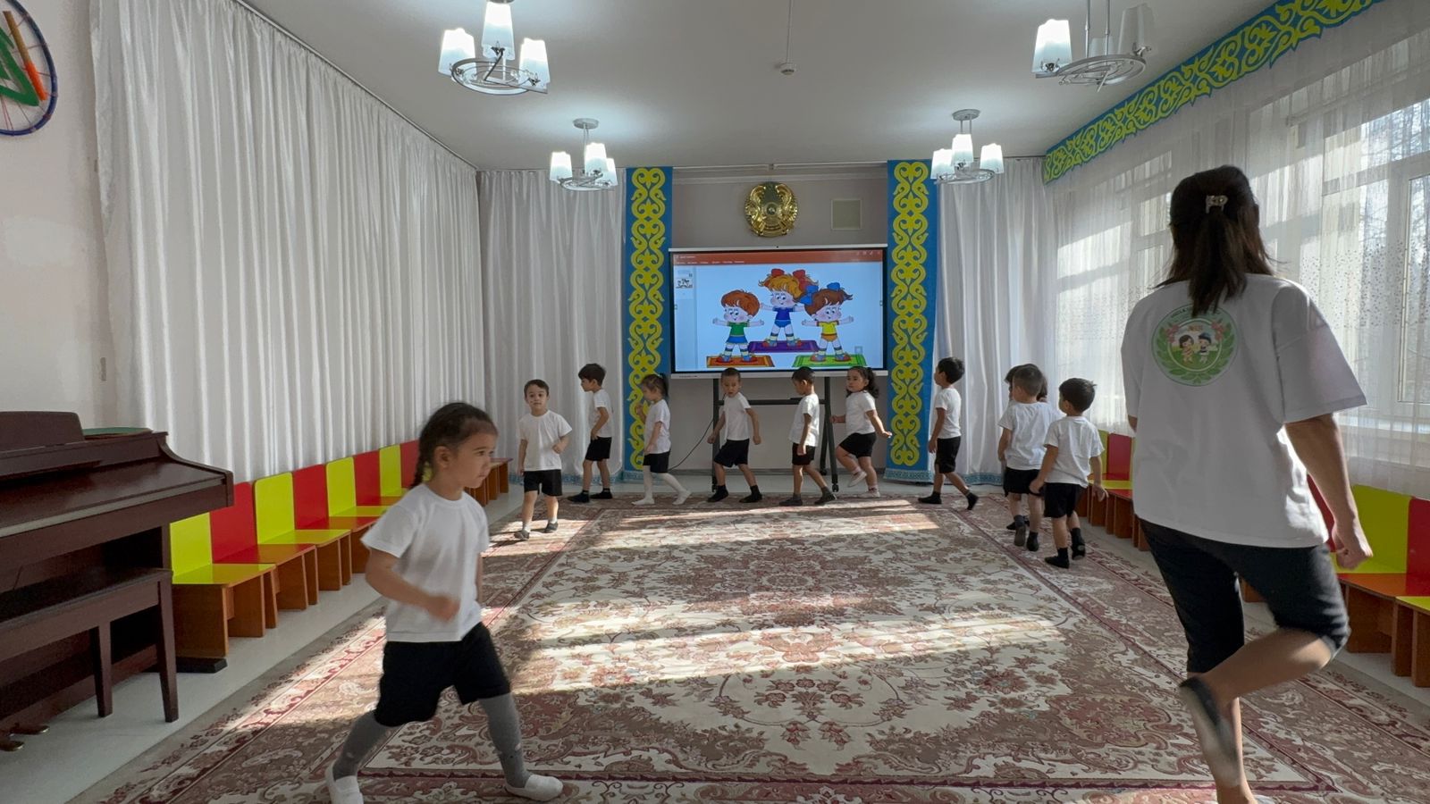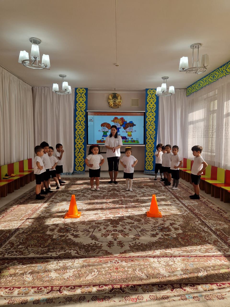 Мақсаты:Балалардың денесін дұрыс ұстау дағдыларын қалыптастыру.Тепе-теңдікті сақтап қозғалу іскерлігін дамыту.Нақты,баяу,үйлесімді қозғалыс жасауға үйрету.