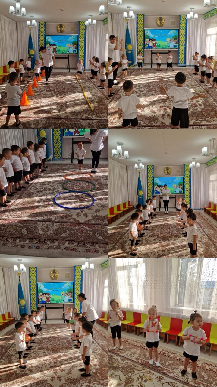 Мақсаты:Балалардың негізгі қимыл-қозғалыс дағдыларын (жүру, жеңіл жүгіру, секіру, еңбектеу, лақтыру) дамыту.