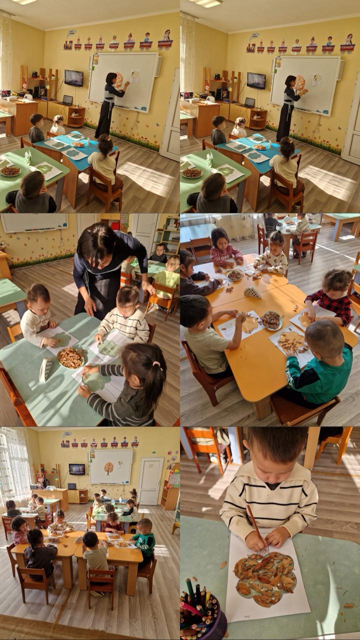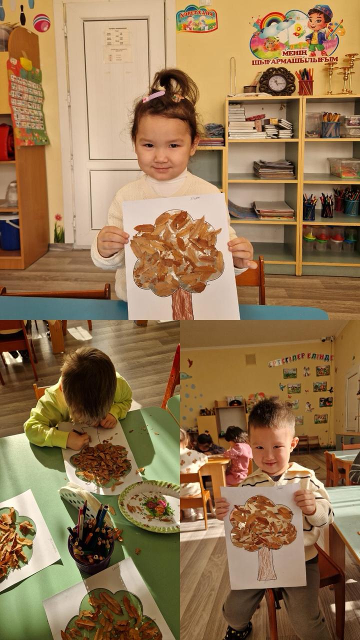 Мақсаты:Балалардың күз мезгілі туралы түсініктерін кеңейту, ағаш бейнесін құрастыра отырып ұсақ моторикасын, қол қимылын және шығармашылық қабілетін дамыту; қураған жапырақтарды жабыстыру арқылы табиғатқа қызығушылықтарын арттыру.