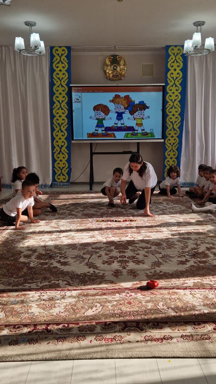 Мақсаты:Балалардың денесін дұрыс ұстау дағдыларын қалыптастыру.Тепе-теңдікті сақтап қозғалу іскерлігін дамыту.Нақты,баяу,үйлесімді қозғалыс жасауға үйрету.