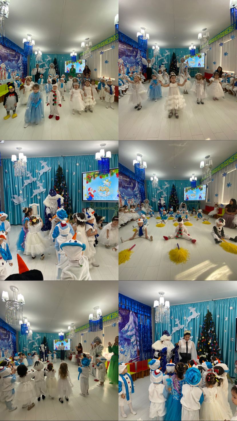 Мақсаты:Балалардың жаңа жыл мерекесіне деген қызығушылығын арттыру, мерекелік көңіл-күй қалыптастыру, ән айту, би билеу, ойындар арқылы шығармашылық қабілеттерін дамыту және ұжыммен әрекеттесе білуге тәрбиелеу.