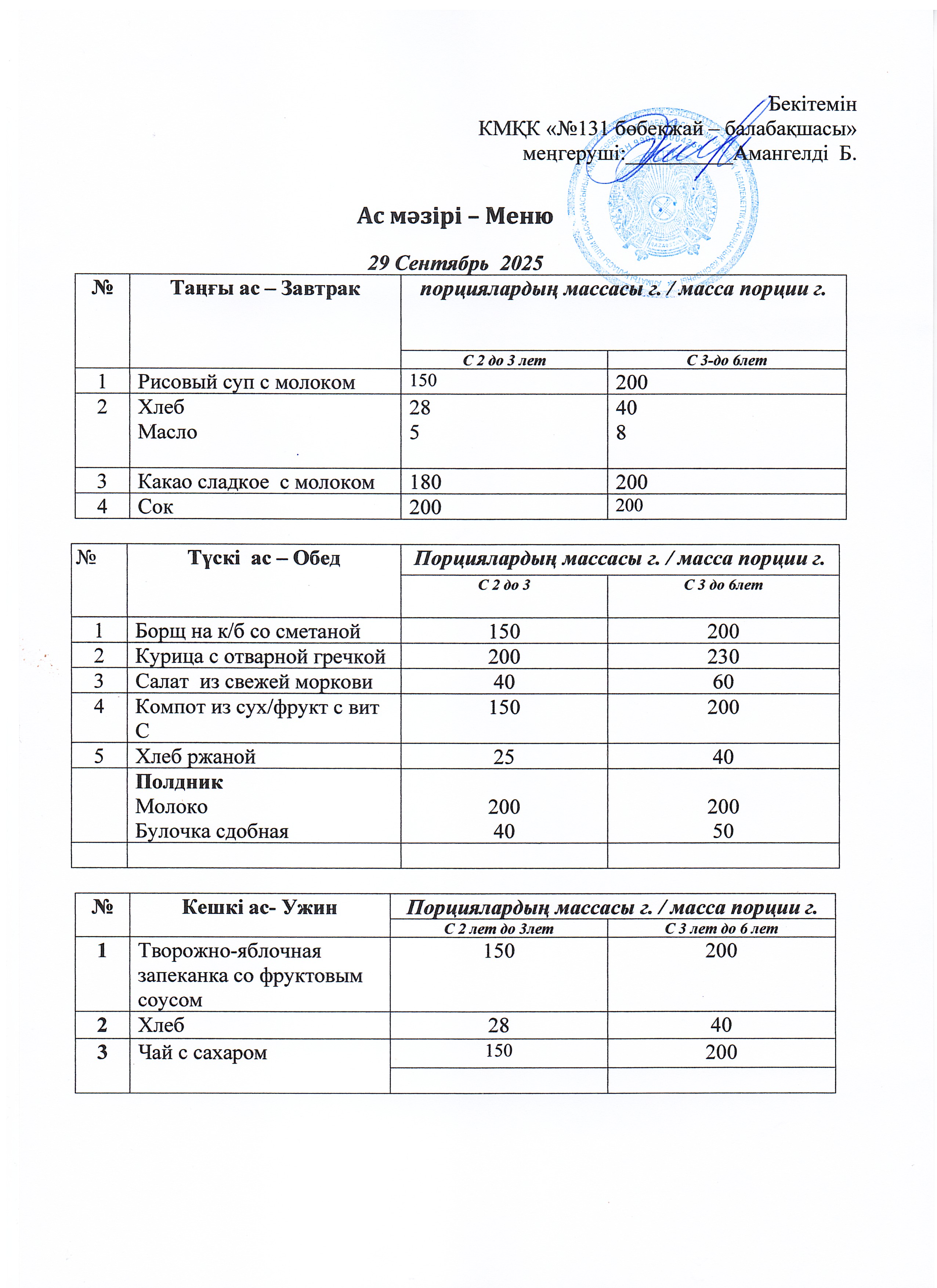 Меню 29 Сентябрь 2025 г » КГКП "Ясли сад №131"