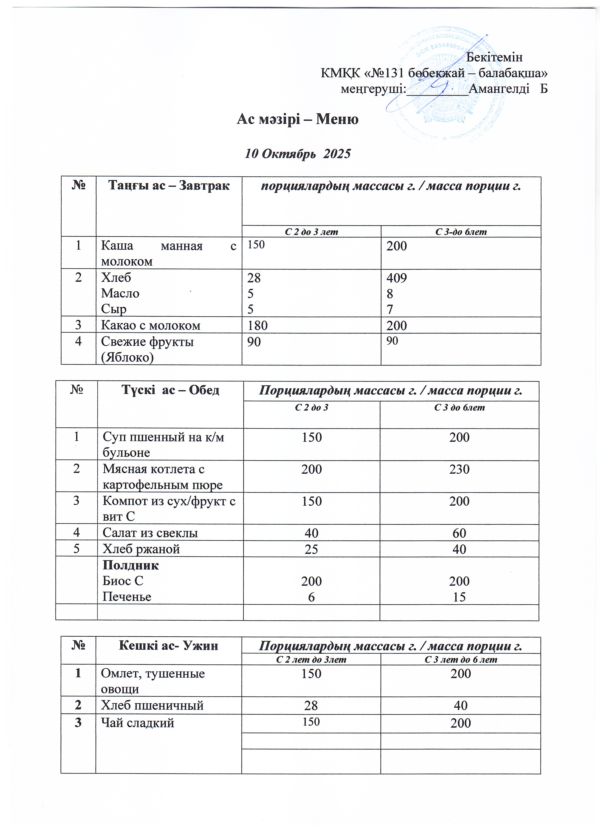 Меню 10 Октябрь 2025 г » КГКП "Ясли сад №131"