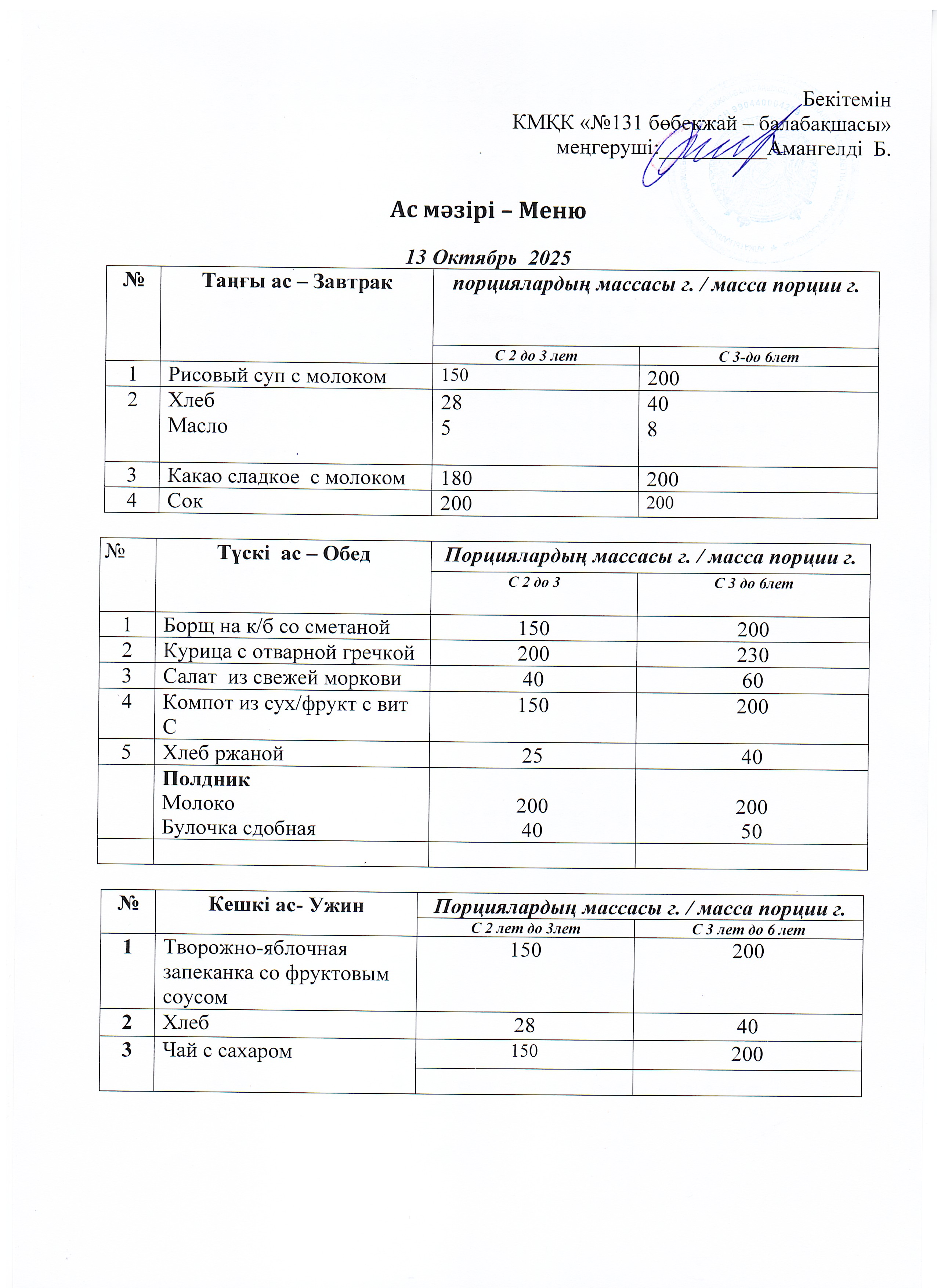 Меню 13 Октябрь 2025 г » КГКП "Ясли сад №131"