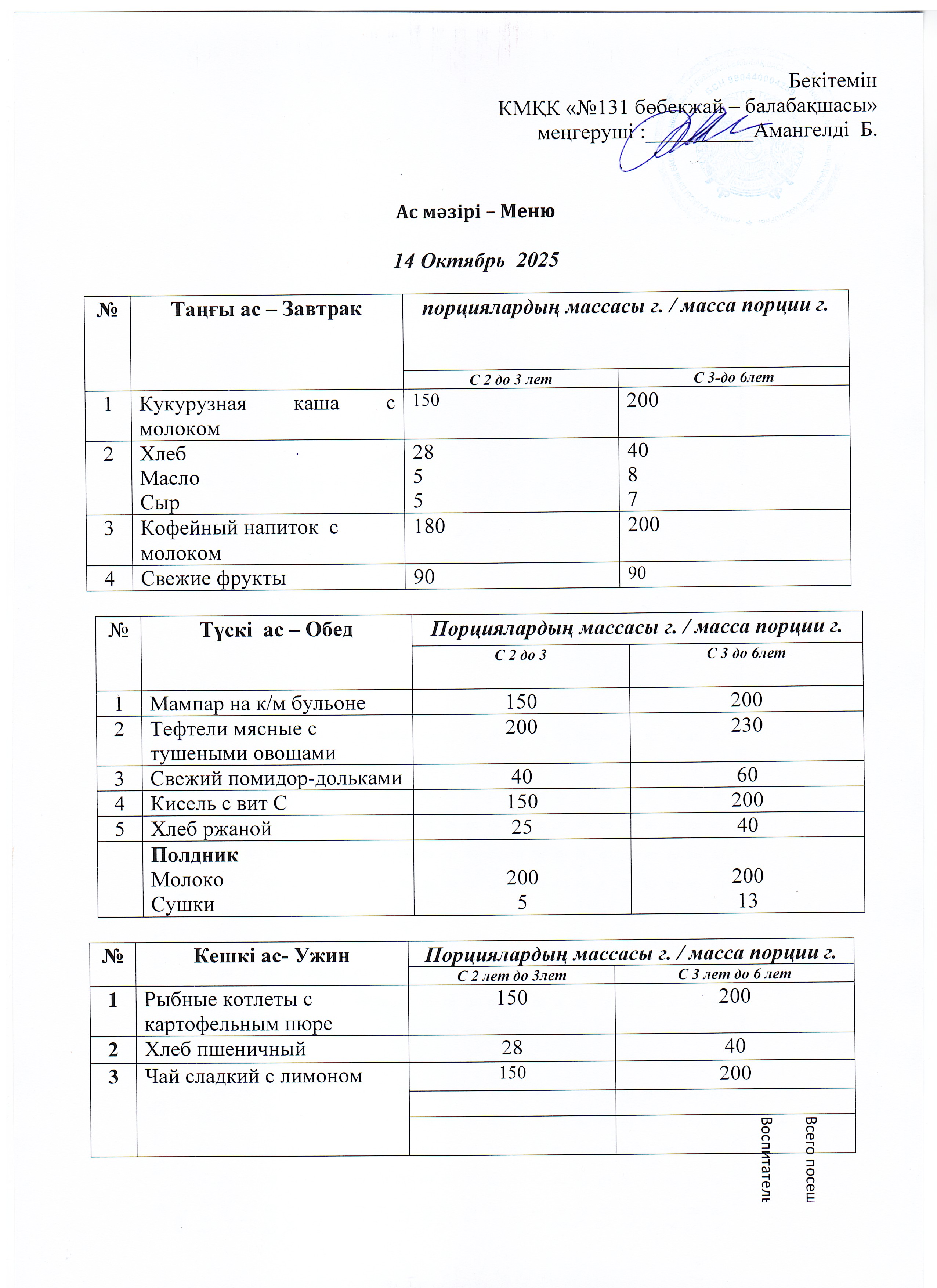 Меню 14 Октябрь 2025 г » КГКП "Ясли сад №131"