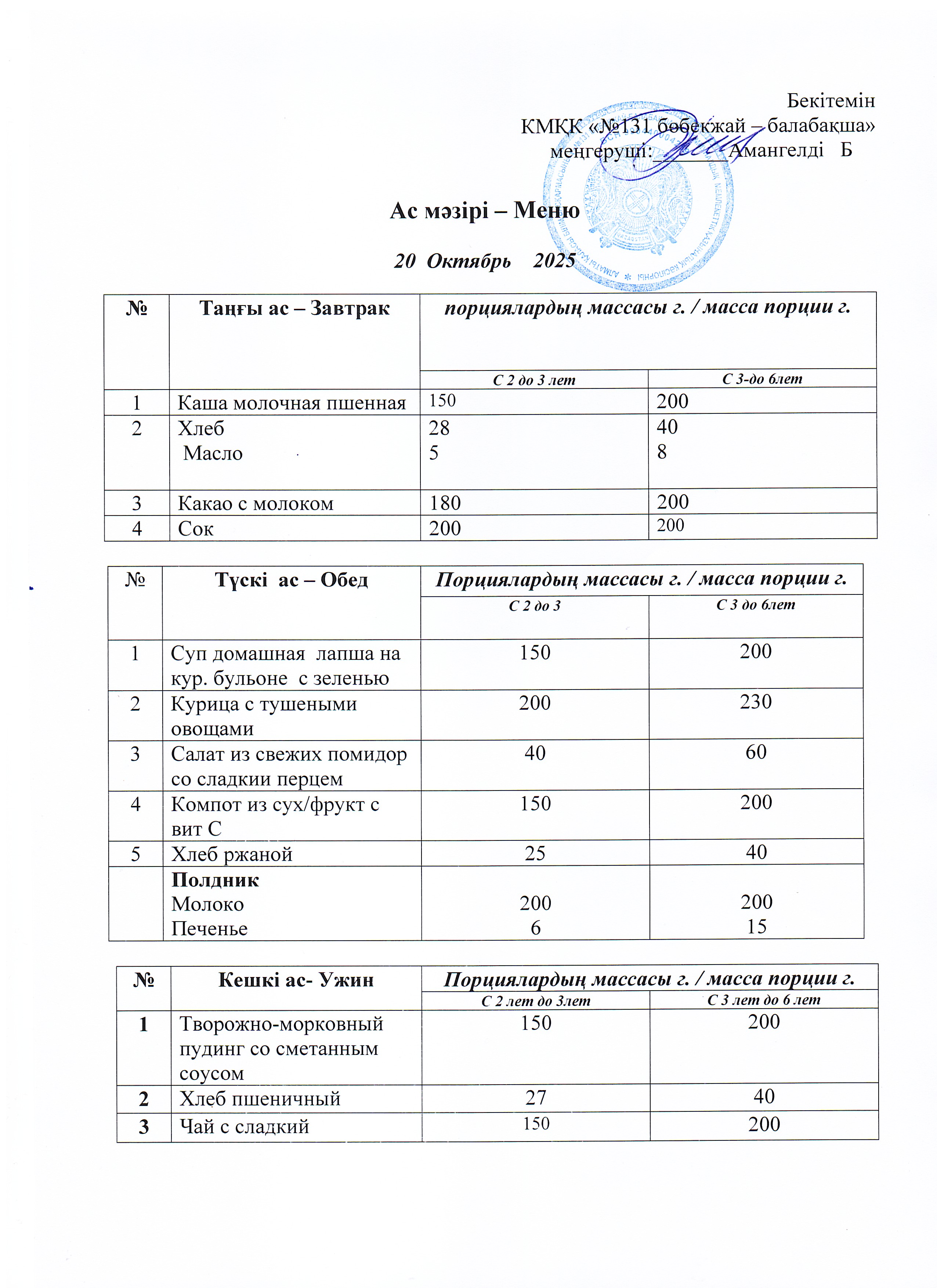 Меню 20 Октябрь 2025 г » КГКП "Ясли сад №131"