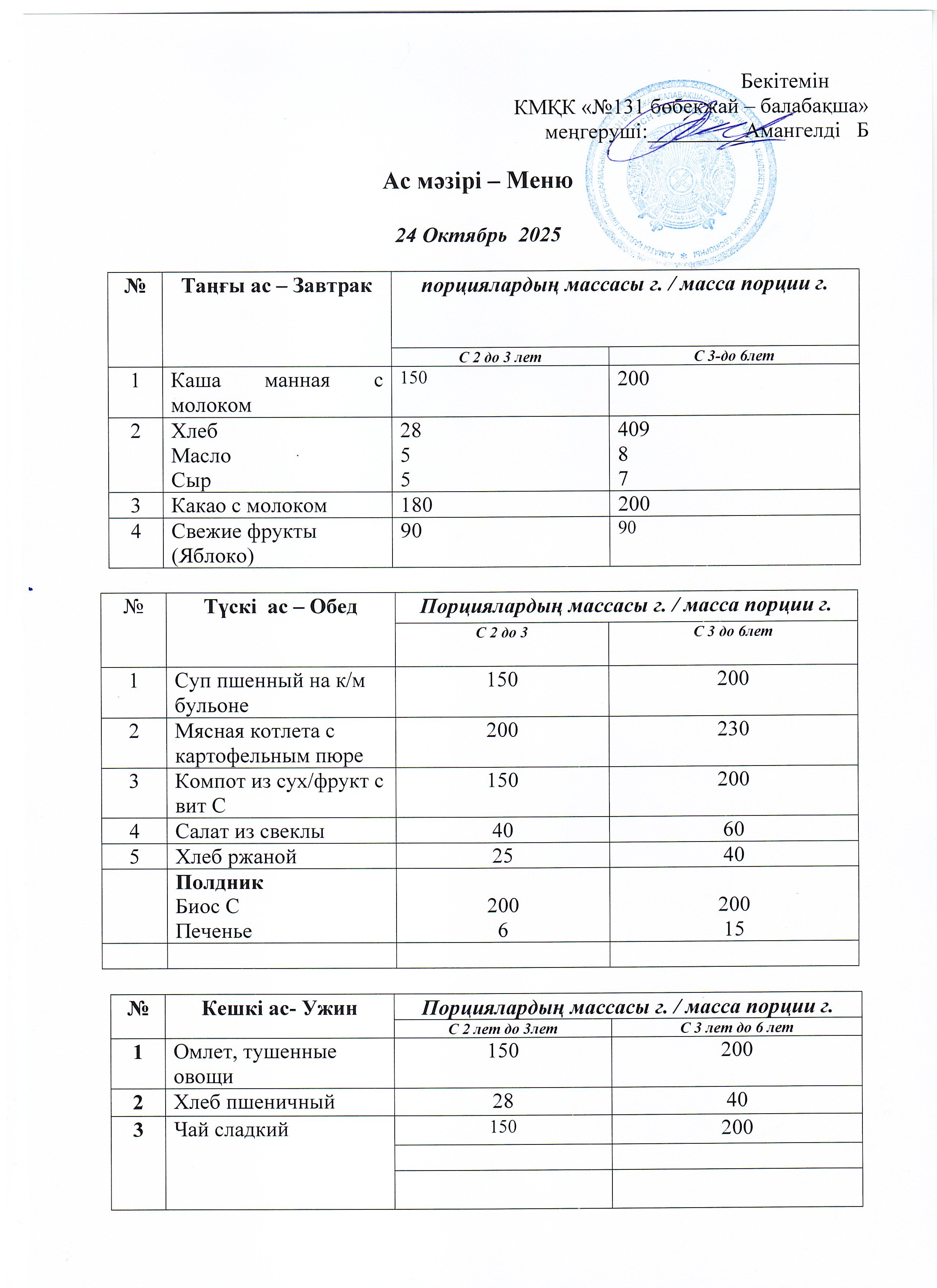 Меню 24 Октябрь 2025 г » КГКП "Ясли сад №131"