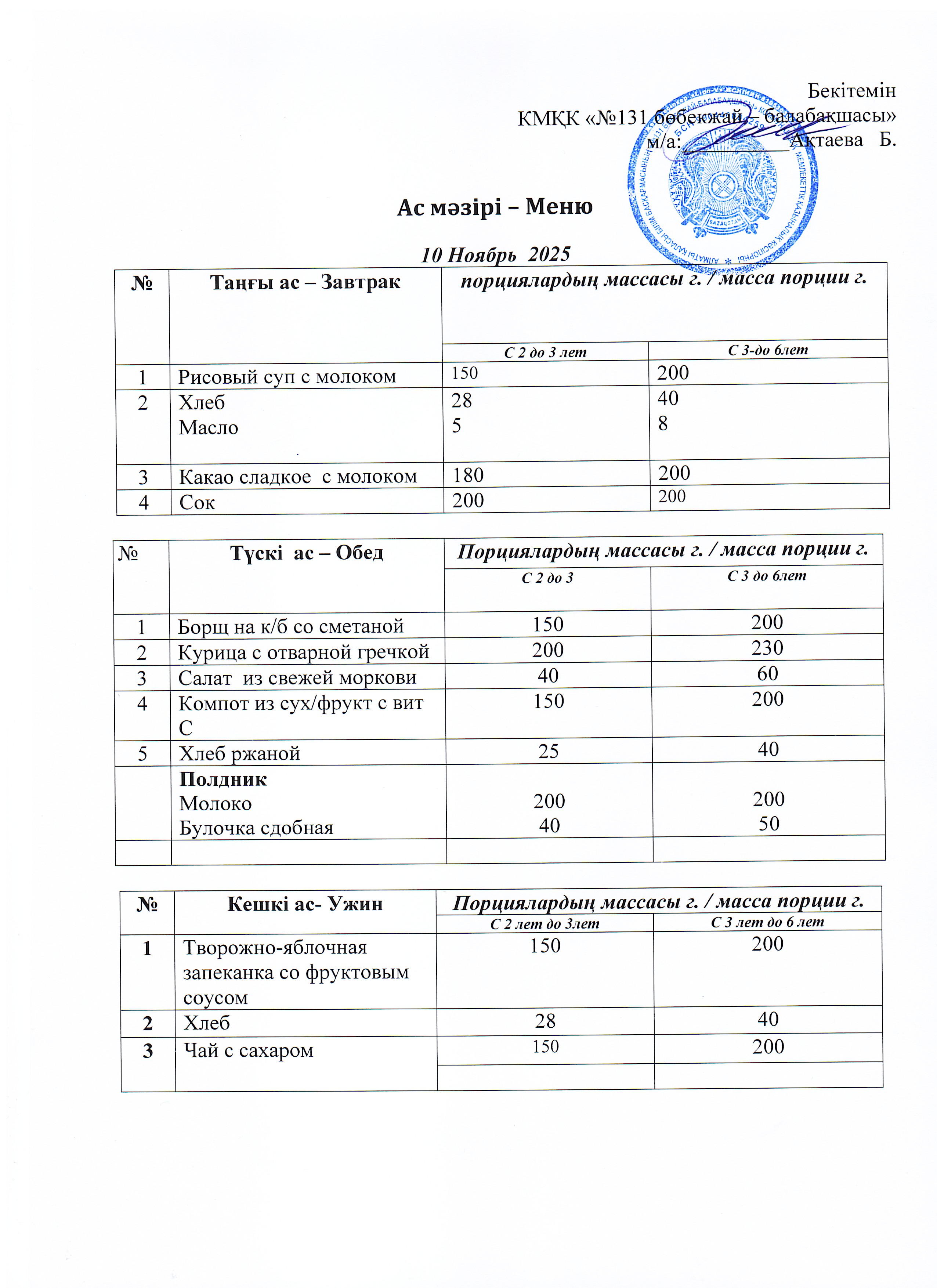 Меню 10 Ноябрь 2025 г » КГКП "Ясли сад №131"