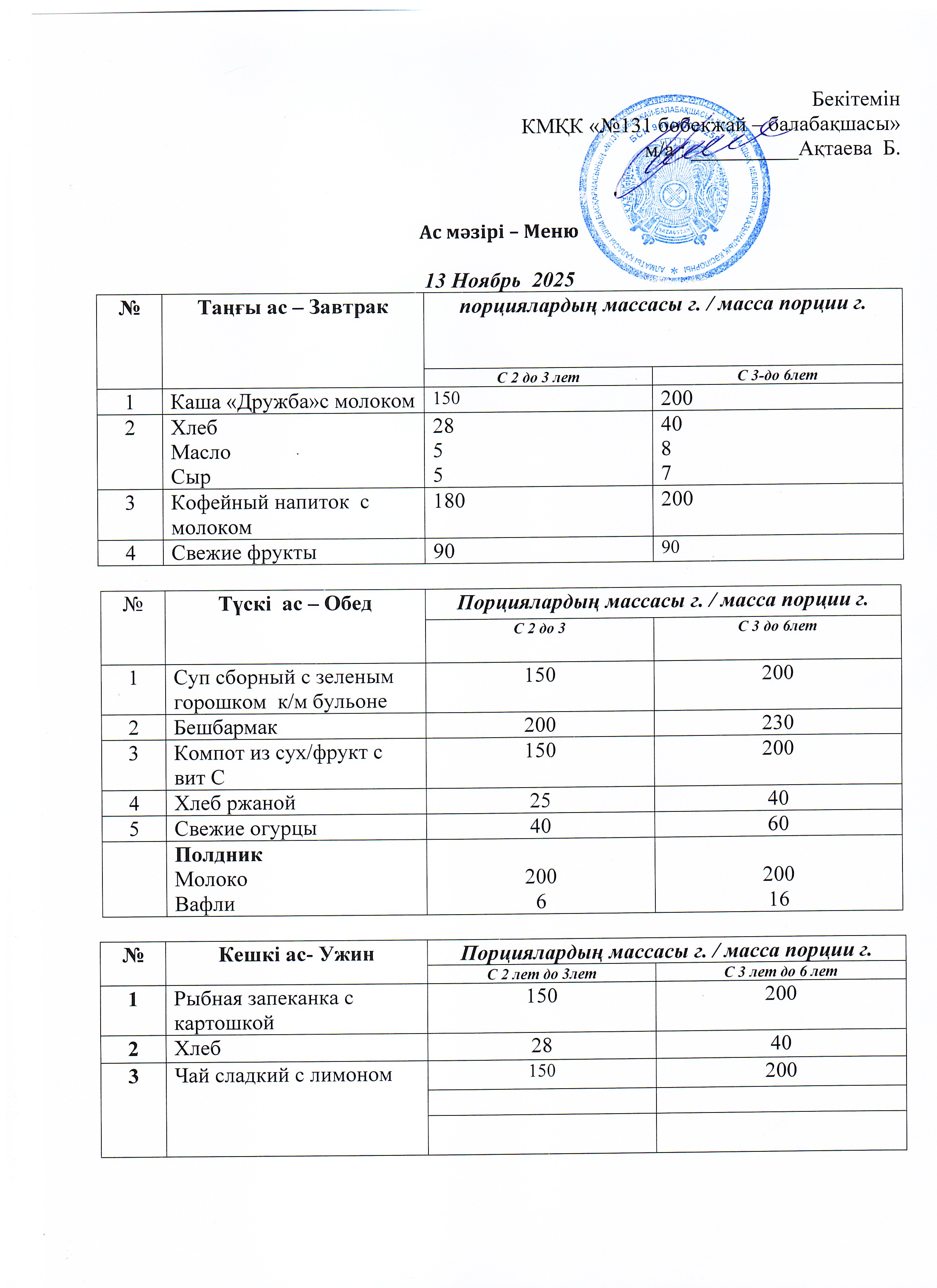 Меню 13 Ноябрь 2025 г » КГКП "Ясли сад №131"