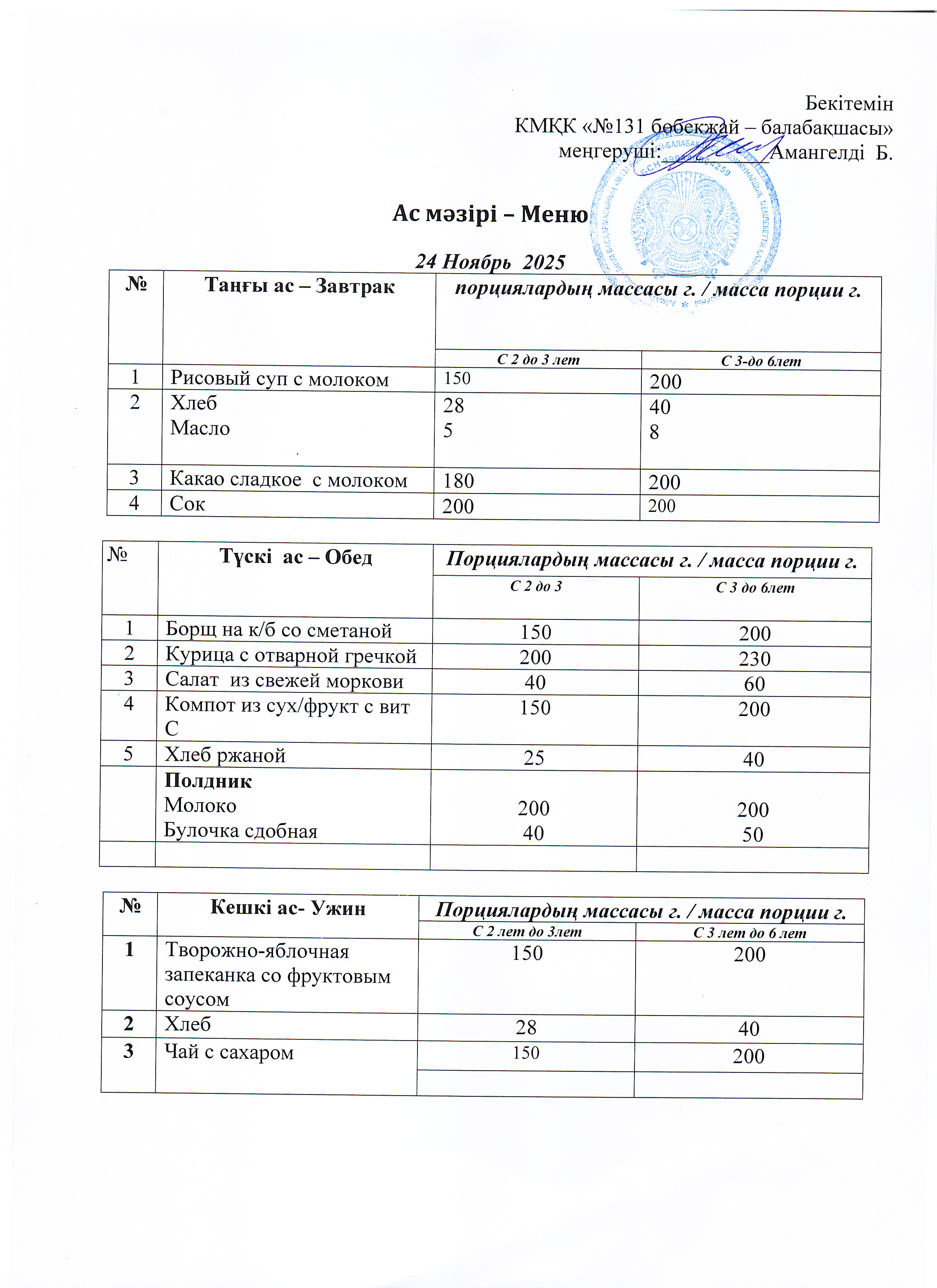 Меню 24 Ноябрь 2025 г » КГКП "Ясли сад №131"