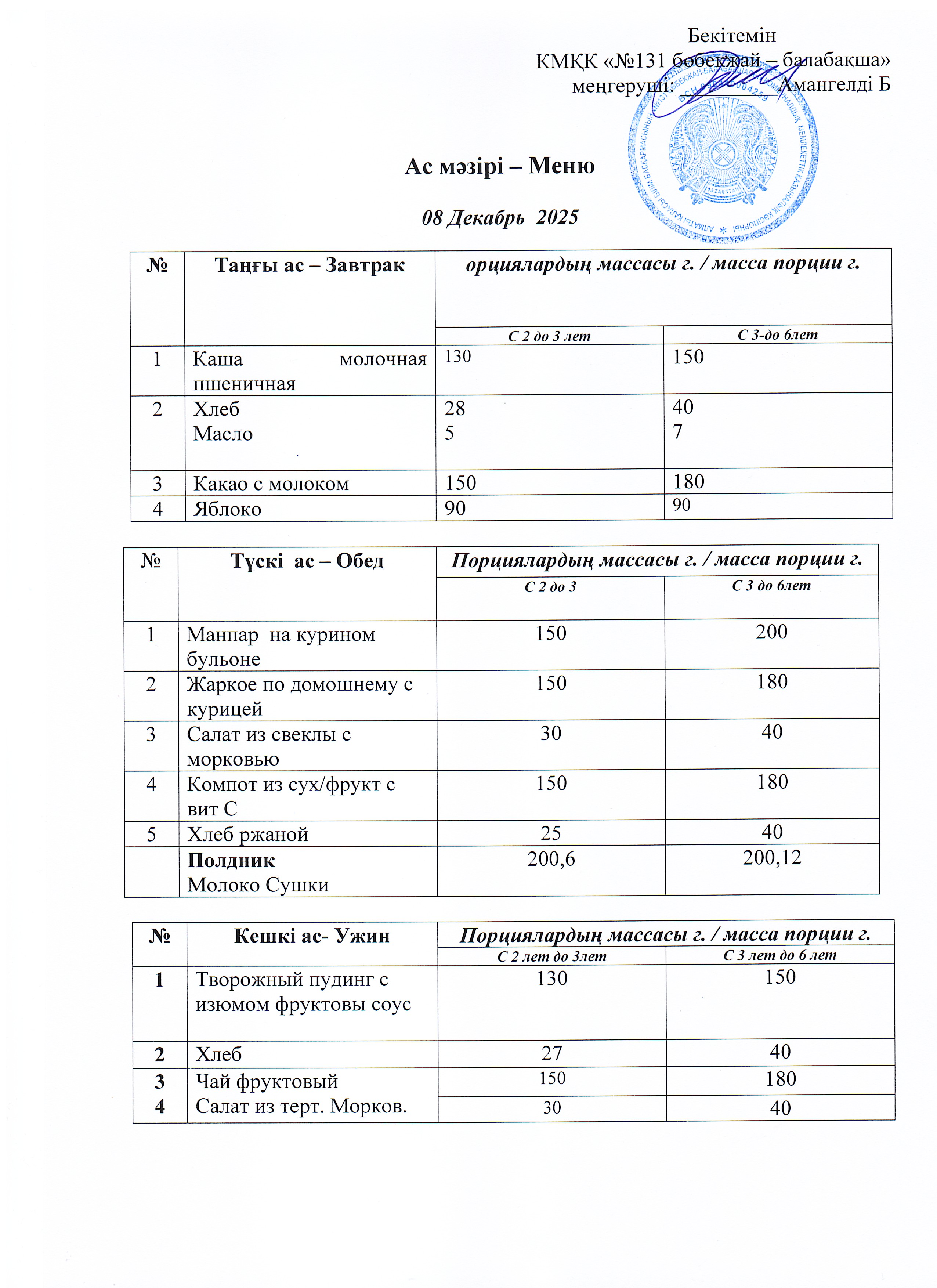 Меню 08 Декабрь 2025 г » КГКП "Ясли сад №131"