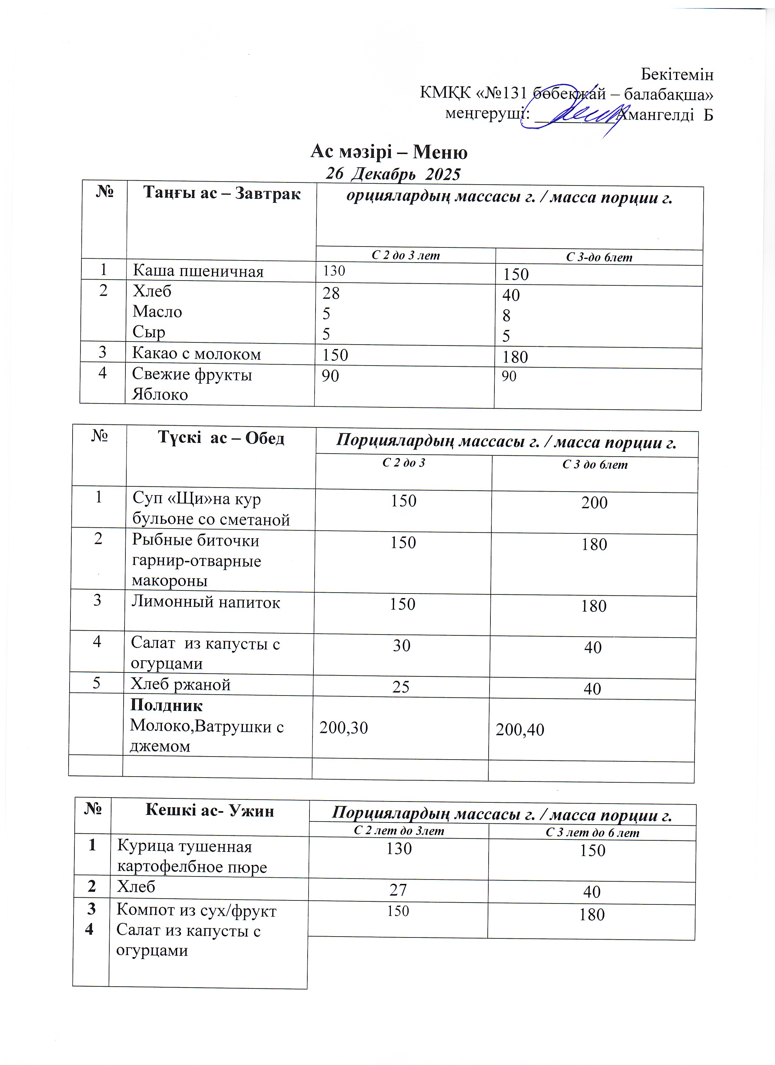 Меню 26 Декабрь 2025 г » КГКП "Ясли сад №131"