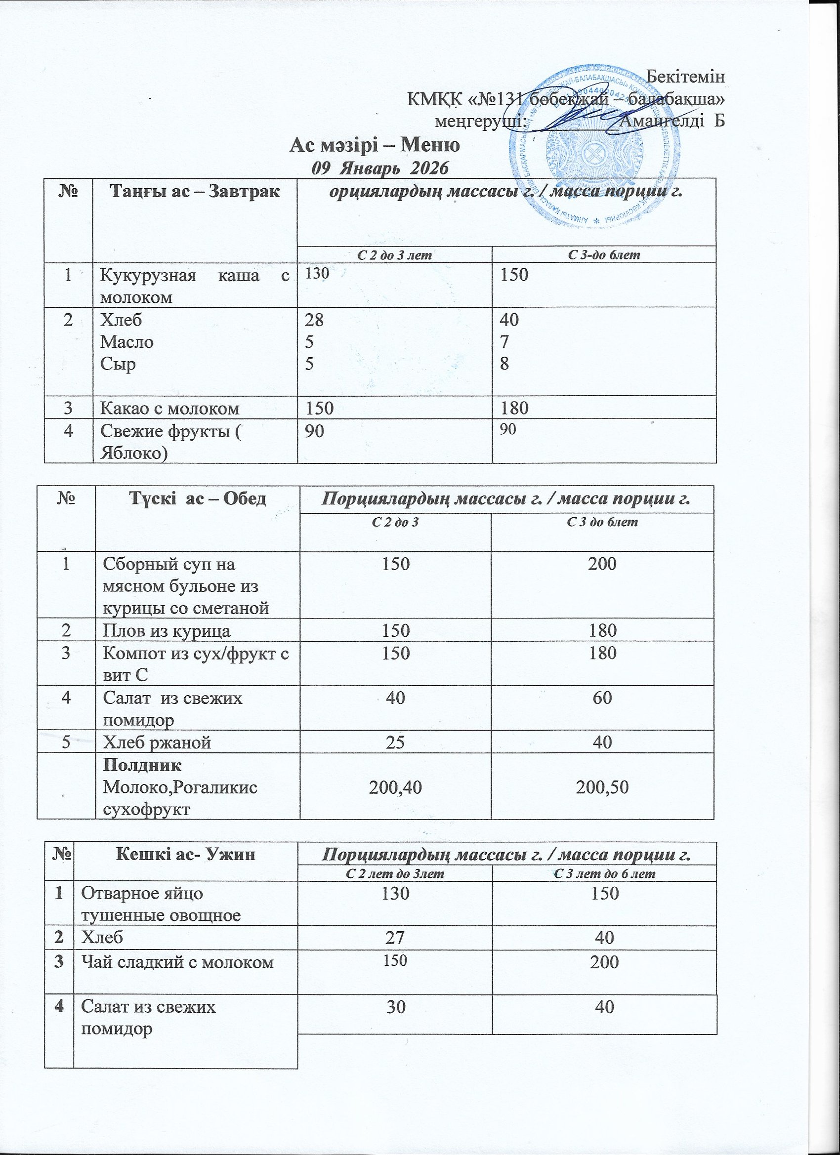 Меню 09 Январь 2026 г » КГКП "Ясли сад №131"