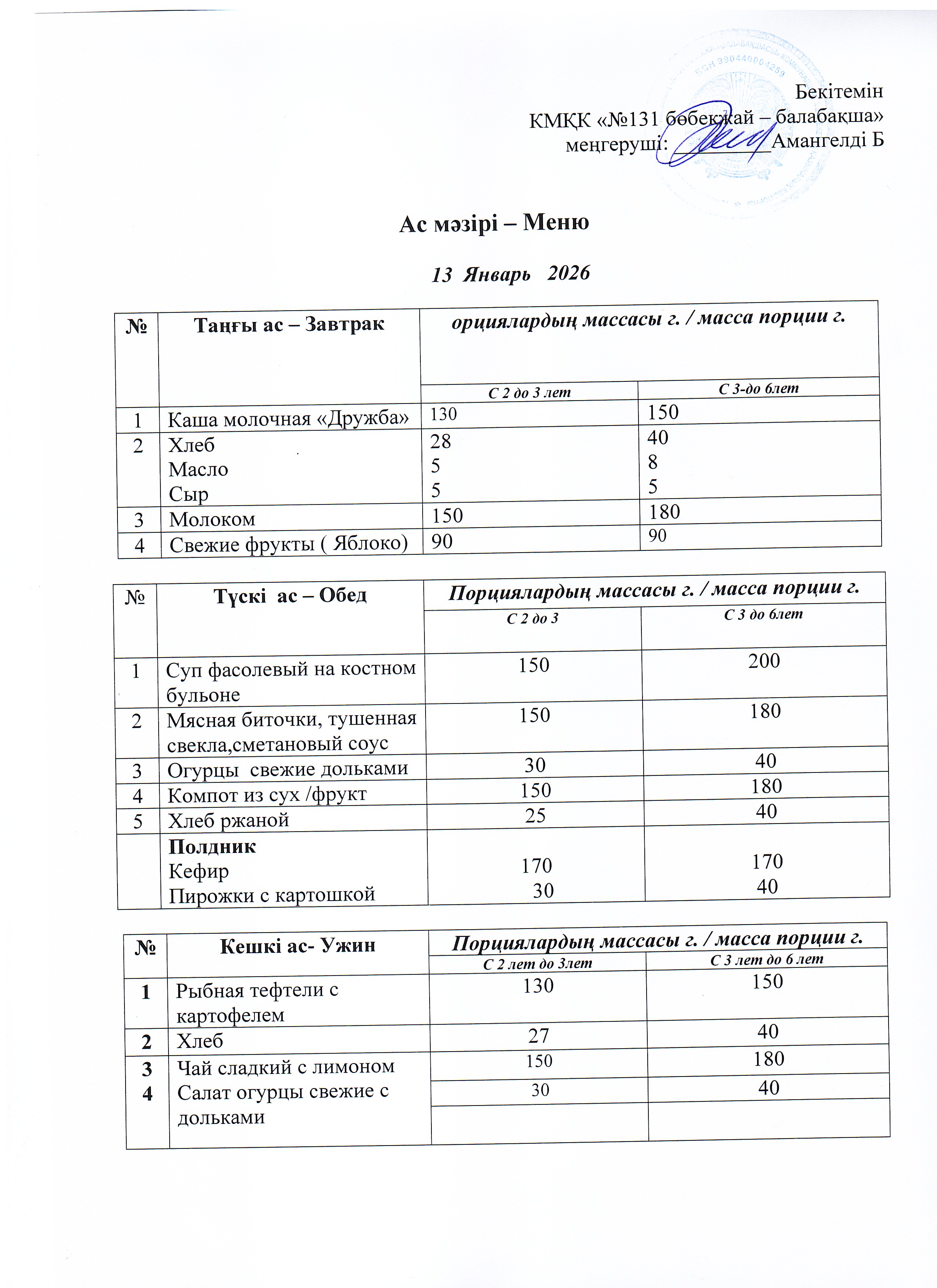 Меню 13 Январь 2026 г » КГКП "Ясли сад №131"