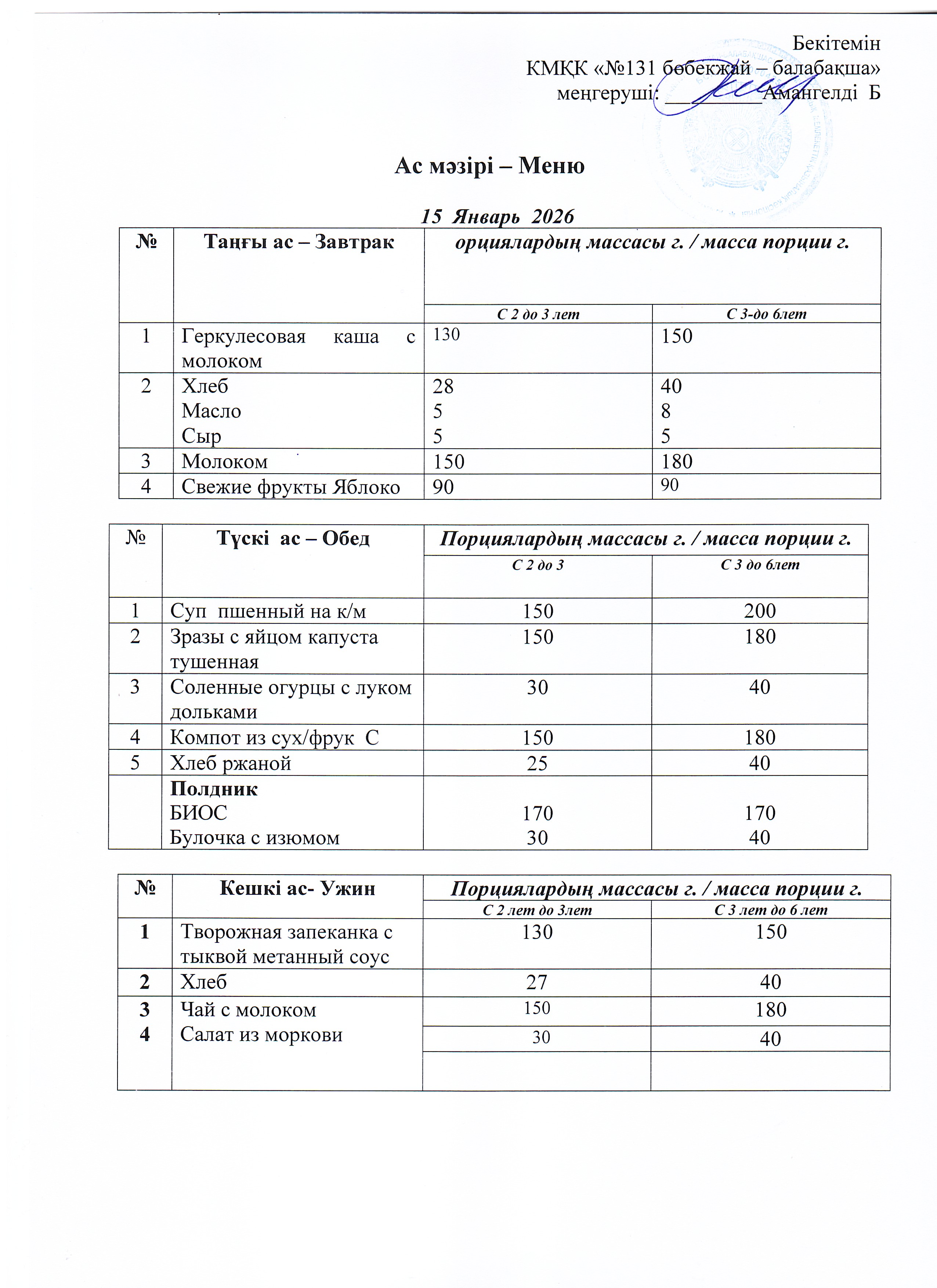 Меню 15 Январь 2026 г » КГКП "Ясли сад №131"