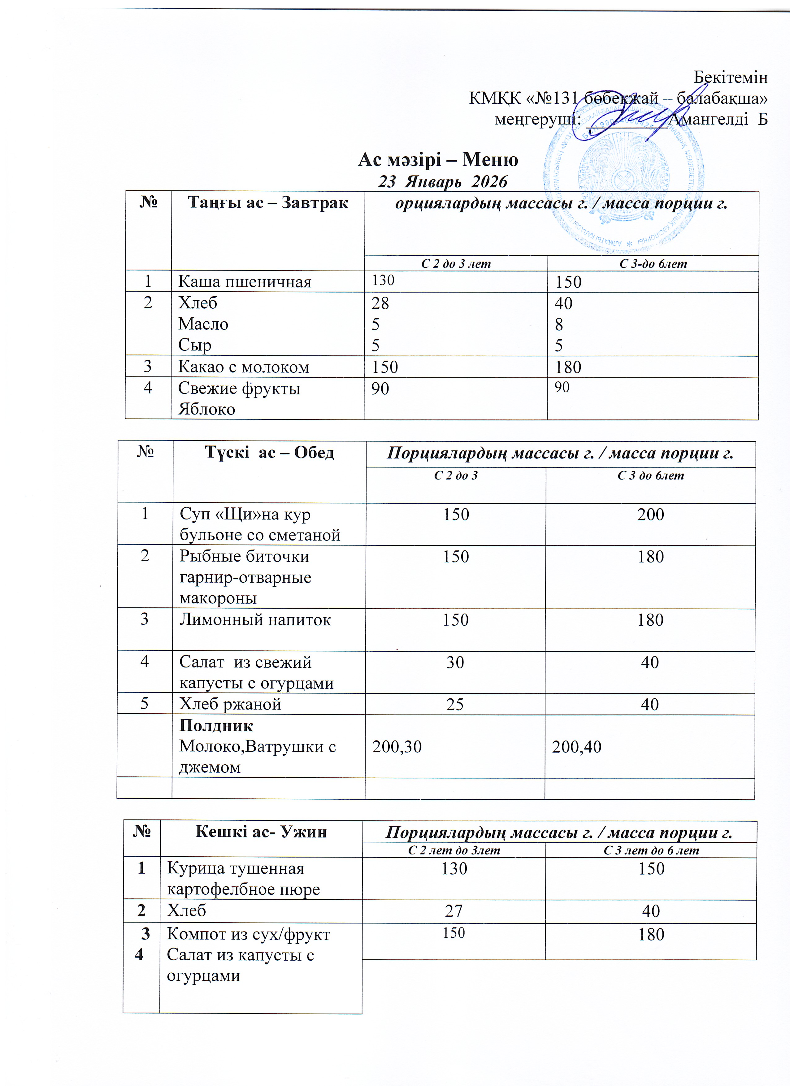 Меню 23 Январь 2026 г » КГКП "Ясли сад №131"