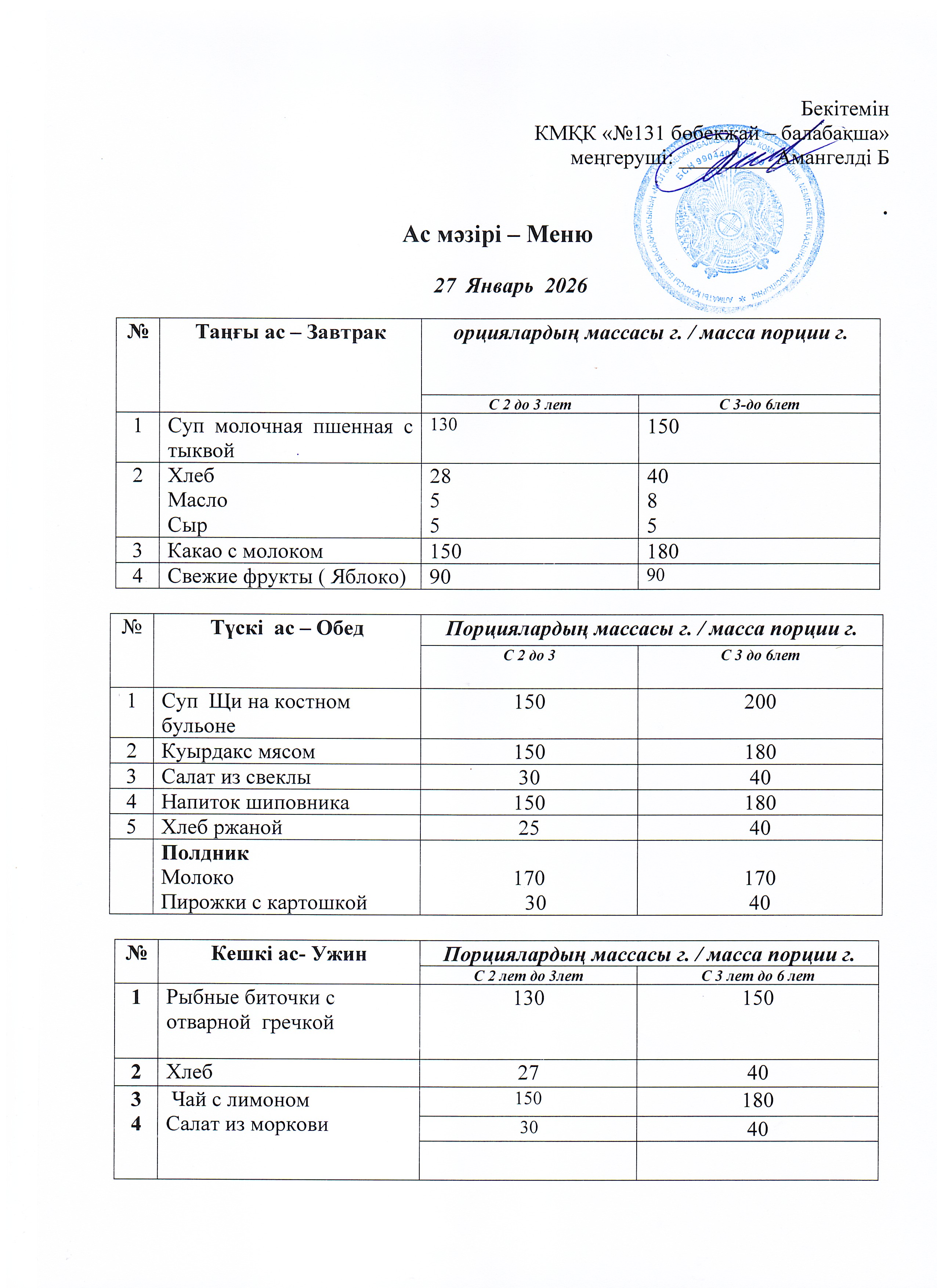 Меню 27 Январь 2026 г » КГКП "Ясли сад №131"