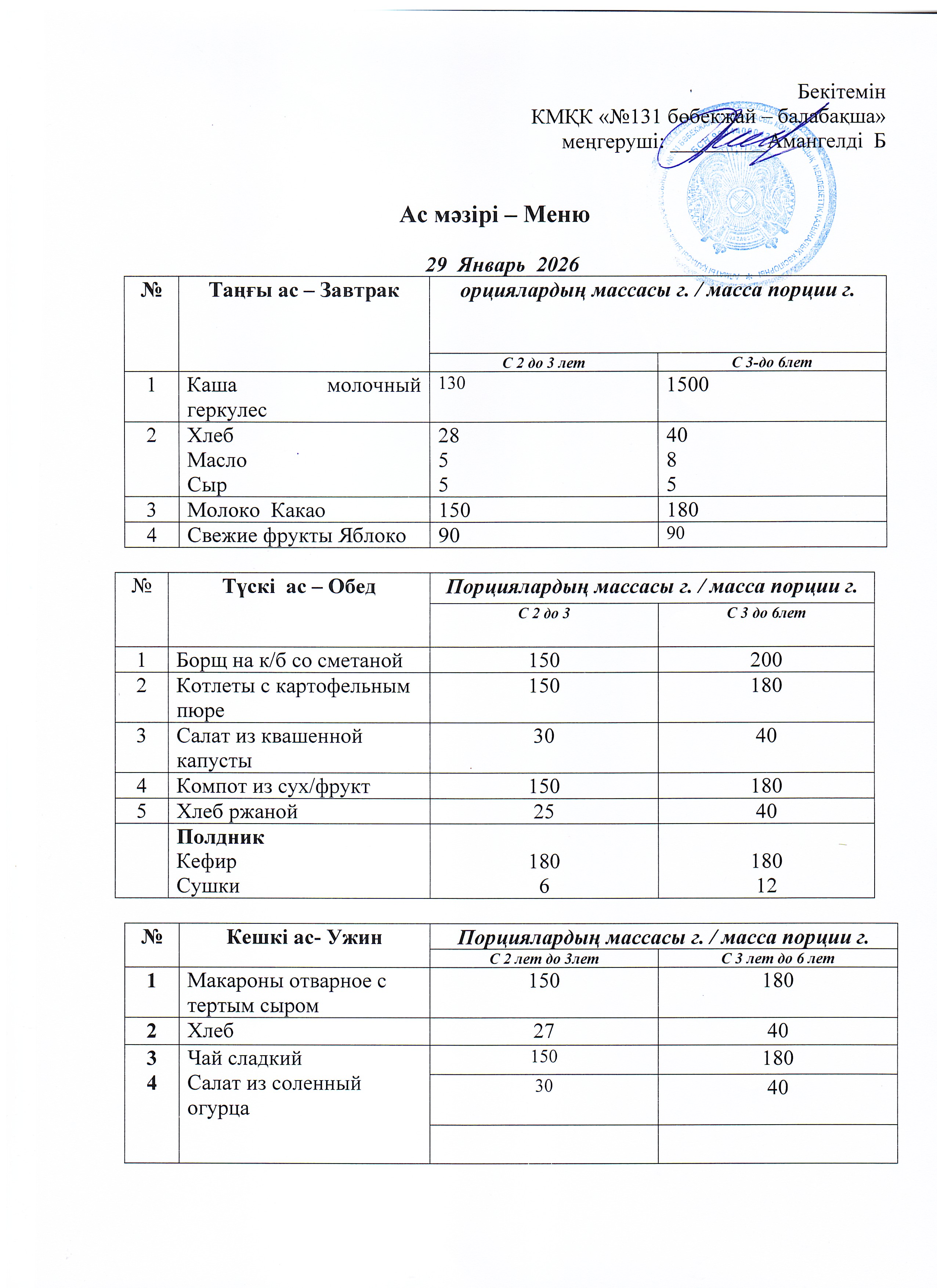 Меню 29 Январь 2026 г » КГКП "Ясли сад №131"